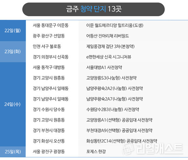 부동산인포에 따르면 1월 4주 신규 청약 및 입주자를 모집하는 곳은 13곳, 총 7,855가구로 집계됐습니다(총 가구수 기준).