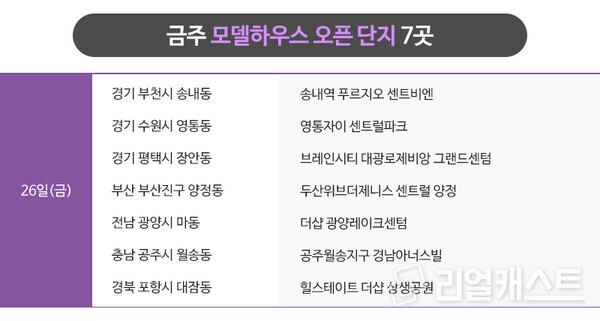 금주 모델하우스 오픈 예정인 곳은 총 7곳입니다. 권역별로는 수도권 3곳, 지방 4곳 등입니다.