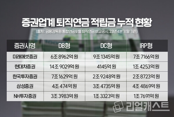 미래에셋증권은 23년 4분기 말 기준 기준 DB(확정급여)형 6조 8962억 원, DC(확정기여)형 9조 1345억 원, 개인형 퇴직연금(IRP) 7조 7166억 원으로 총 23조 7473억 원을 적립하고 있습니다.