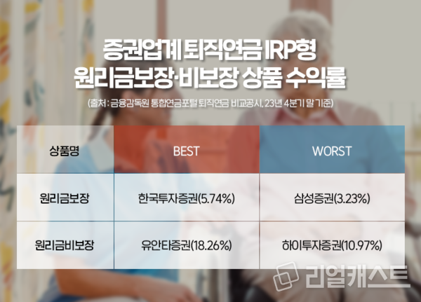 IRP형 원리금 비보장 상품 수익률 1위는 유안타증권(18.26%)이며, 2위는 한국포스증권(17.04%), 3위는 삼성증권(16.64%)으로 나타났습니다. 최저 수익률은 하이투자증권(10.97%)이 기록했습니다.