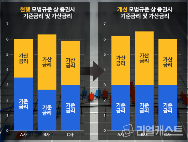 또한 현행 모범규준은 기준금리 및 가산금리 세부항목을 월별 또는 분기별로 재산정하도록 정하고 있으나 증권사들은 형식적으로 이행하는 측면이 있어 모범규준 취지가 제대로 실현되지 못하고 있습니다.