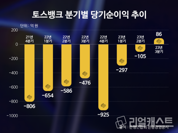 고객들이 늘어나자 토스뱅크의 수익성도 개선되고 있는 것으로 나타났습니다. 토스뱅크는 23년 3분기 86억 원의 당기순이익을 거두며 만 2년 만에 흑자전환에 성공했습니다. 경쟁자인 케이뱅크가 약 4년여간 적자 늪에서 탈출하지 못한 것과 비교하면 괄목할만한 성과입니다. 이런 흐름은 갑신년에도 이어지며 올해 연간 흑자 달성이 가능할 것으로 예상됩니다.