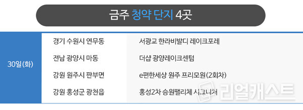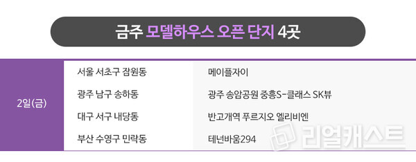 금주 모델하우스 오픈 예정인 곳은 총 4곳입니다. 권역별로는 수도권 1곳, 지방 3곳 등입니다.