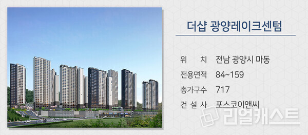 포스코이앤씨는 전남 광양시 마동에 짓는 ‘더샵 광양레이크센텀’을 분양합니다. 가야산 자락에 위치하고 마동생태공원, 마동저수지 등 주거환경이 쾌적합니다. 포스코 광양제철소를 비롯해 광양항, 광양국가산단 등의 대규모 업무시설로 출퇴근이 수월합니다.