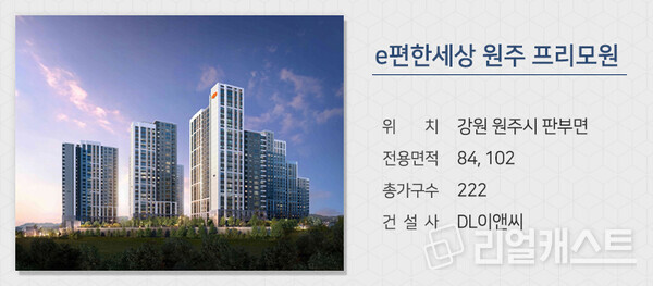 DL이앤씨는 강원 원주시 판부면에서 ‘e편한세상 원주 프리모원’을 분양합니다. 단지 인근에 녹지 공간이 있고, 단지 전면동에서는 백운산 등을 조망할 수 있습니다. 남원주IC를 통해 중앙고속도로로 진입이 수월하고, 무실지구 일대 생활인프라도 이용할 수 있습니다.