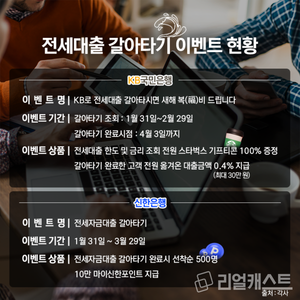 먼저 KB국민은행(은행장 이재근)은 ‘KB로 전세대출 갈아타시면 새해 복(福)비 드립니다’ 이벤트를 진행합니다. 오는 29일까지 해당 기간 내 KB스타뱅킹 대출이동서비스에서 전세대출 한도 및 금리를 조회한 고객 전원에게 스타벅스 아메리카노 기프티콘을 증정합니다. 또한 4월 3일까지 타 금융사의 전세대출 갈아타기를 완료한 고객에게 옮겨온 대출금액의 0.4%(최대 30만 원)를 KB복(福)비로 지급합니다.