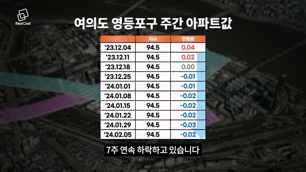 한국부동산원 주간 아파트값 통계를 보면, 여의도가 위치한 영등포구는 지난해 12월 3주 이후 7주 연속 하락하고 있습니다.