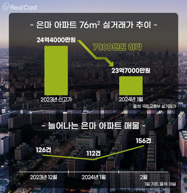 이렇다 보니 집값도 흔들리고 있습니다. 은마 전용 76㎡의 경우 지난해 24억4000만원에 신고가를 썼는데 올해 1월에는 7000만원이 떨어진 23억7000만원에 거래됐습니다.