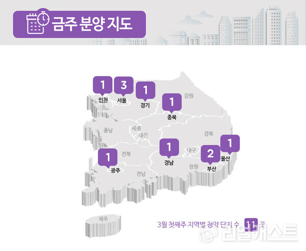 부동산인포에 따르면 3월 1주 신규 청약 및 입주자를 모집하는 곳은 11곳, 총 7146가구로 집계됐습니다(총 가구수 기준).