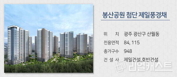 제일건설과 호반건설은 광주 광산구 산월동에 짓는 ‘봉산공원 첨단 제일풍경채’를 분양합니다. 봉산공원 민간공원 특례사업 단지로 공원 내 다양한 편의시설을 쉽게 이용할 수 있습니다. 첨단지구 인프라를 누릴 수 있고, 산월IC를 통해 호남고속도로로 빠른 이동이 가능합니다.