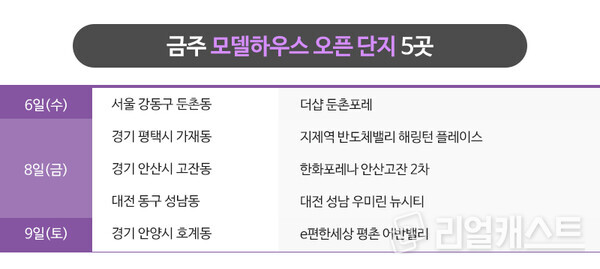 이외에 한화 건설부문은 경기 안산시 고잔동에 짓는 ‘한화포레나 안산고잔2차’ 모델하우스를, DL건설은 경기 안양시 호계동 일원에 짓는 ‘e편한세상 평촌 어반밸리’ 모델하우스를 오픈 할 계획입니다.