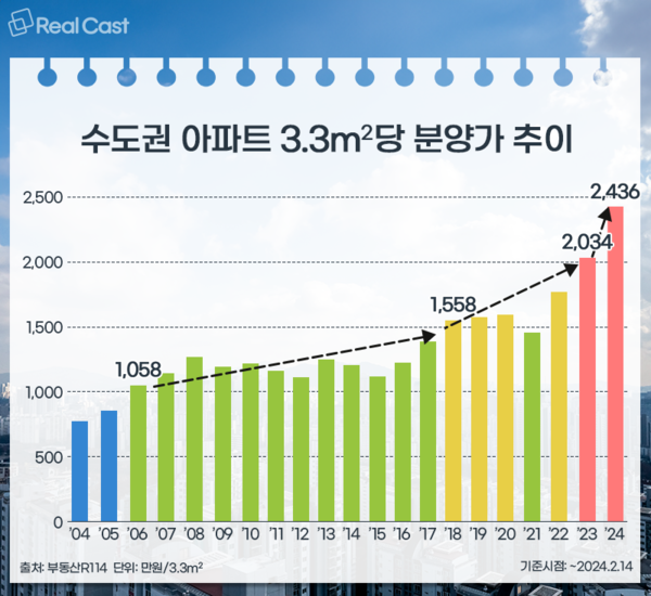 수도권 아파트 분양가는 3.3㎡당 2천만 원을 돌파했습니다. 부동산114 자료에 따르면, 지난해 수도권(서울, 인천, 경기)에 분양한 아파트 126개 단지의 평균 분양가는 3.3㎡당 2,034만 원으로 집계되었습니다. 수도권 분양 단지의 3.3㎡당 분양가가 2천만 원을 넘은 건 사상 처음입니다.