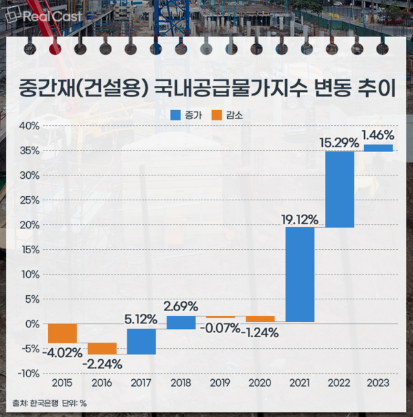 실제로 건설자재 가격은 지난 3년 사이 38.27% 오른 것으로 나타났습니다. 한국은행 생산자물가조사 자료에 따르면 2020년 1월 기준 104.32p였던 건설용 중간재 물가지수는 지난해 12월 144.24p로 높아졌습니다. 같은 기간 건설공사비지수 역시 118.58p에서 152.47p로 28.58% 올랐죠.