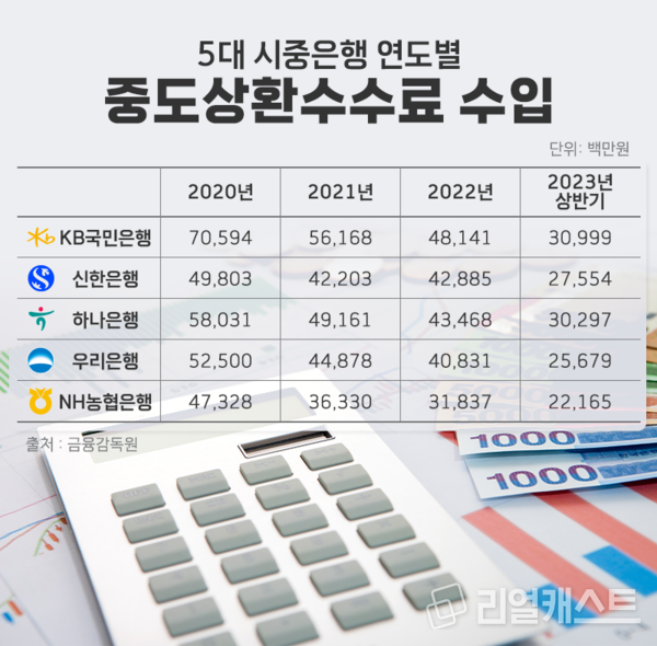 이에 따른 중도상환수수료로 은행이 벌어들이는 연간 금액은 3000억 원 가량으로 확인됐습니다. 금융감독원(이하 금감원)에 따르면 5대 시중은행의 중도상환수수료 수입은 2020년 3844억 원, 2021년 3174억 원, 2022년 2794억 원, 2023년 상반기 1813억 원 등으로 조사됐습니다.