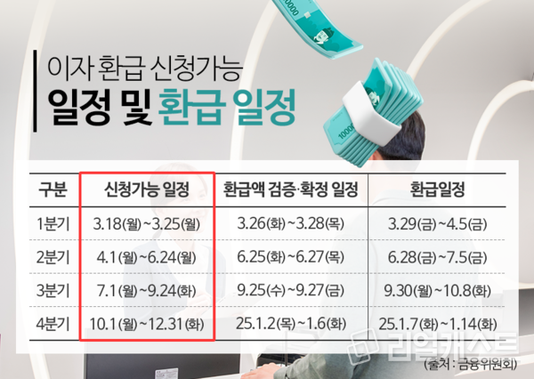 대출자의 환급금액을 검증, 확정하는 시기(분기마다 3영업일)를 제외하면 언제든 신청할 수 있으며 이자 환급은 이달 29일부터 진행됩니다. 환급 가능여부, 지급금액 및 지급시기 등은 신청순서에 따라 달라지지 않습니다. 더불어 1분기 말 환급대상이지만 3월에 신청하지 못한 차주라도 3월 이후 언제든 신청하면 신청일 이후 도래하는 분기 말에 환급을 받게 됩니다.