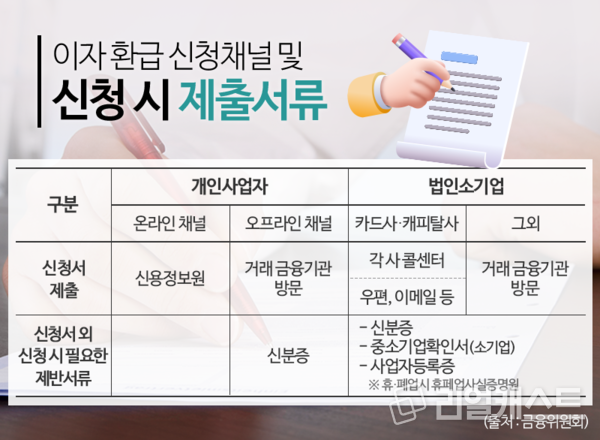 금융위원회(이하 금융위)와 중소벤처기업부는 이달 18일부터 소상공인 대출자 40만 명에게 총 3000억 원 규모의 이자 환급신청을 받습니다. 이에 따라 소상공인 1인당 평균 75만 원의 이자를 돌려받게 될 전망입니다.
