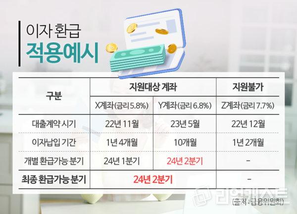 금융기관은 신청이 접수되면 해당 차주가 이자를 1년치 이상 납입했는지를 확인합니다. 1년치 이자가 모두 납입된 후 처음 도래하는 분기의 말일(영업일 기준, 1분기의 경우 3.29일)부터 6영업일 이내 이자 환급금액을 ‘차주 명의의 원리금 자동이체 계좌’에 입금합니다. 이후 그 사실을 차주에게 문자로 알려주게 됩니다.