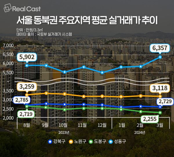 업계 관계자는 “공사비 상승으로 재건축 기대감이 사라지고, 총선까지 한 달 앞으로 다가온 상황이라 시장 전체가 실수요 중심으로 굴러가고 있다”고 설명하며, “노도강은 아직 전용 84㎡가 8~9억 원이라 비싸다는 인식이 있어 거래가 어려운 상황이고, 성동구는 다리 하나만 건너면 강남인데 신축이 강남보다 확실히 저렴하니 매력을 느끼는 실수요가 많다”고 설명했습니다.