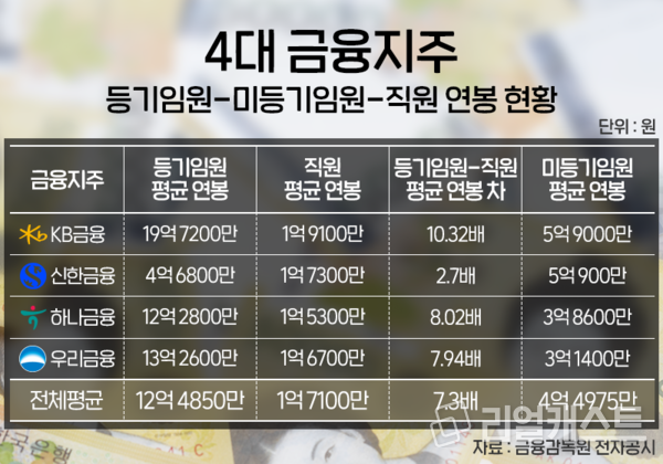 4대 금융지주의 등기임원과 직원의 평균 연봉이 작년말 기준 7.3배 차이 나는 것으로 확인됐습니다.