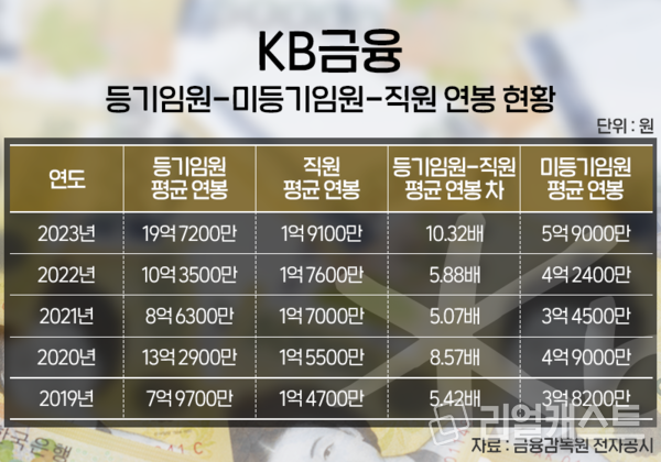 KB금융의 등기임원과 직원과의 평균 연봉차이는 줄고·늘고를 반복하는 모습입니다. 2019년에는 5.42배에 불과했던 등기임원과 직원과의 연봉격차는 2020년 8.57배로 늘어났다 2021·2022년에는 5배 수준에서 머물다 다시 지난해 10.32배까지 늘어난 것입니다. 역대 최대실적을 기록한데 따른 상여금 증가에다 윤종규 전 회장의 퇴임으로 인한 퇴직금까지 더해져 격차가 벌어진 것으로 보이지만 올해는 상황이 넉넉지 않은 만큼 다시 격차는 줄어들 것으로 예상됩니다.