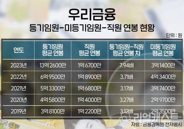 우리금융의 등기임원과 직원과의 평균 연봉차이는 22년까지는 3배정도 수준이었지만 지난해 약 8배까지 차이가 늘어난 상황입니다. 직원들의 연봉은 줄어든 반면 등기임원의 연봉은 2배 가까이 증가했기 때문으로 풀이됩니다. 직원뿐만 아니라 미등기임원의 연봉도 지난해 평균 1억 원 이상 감소한 것으로 나타나며 등기임원에게 연봉 쏠림현상이 나타나는 것이 아닌지 우려스럽습니다.