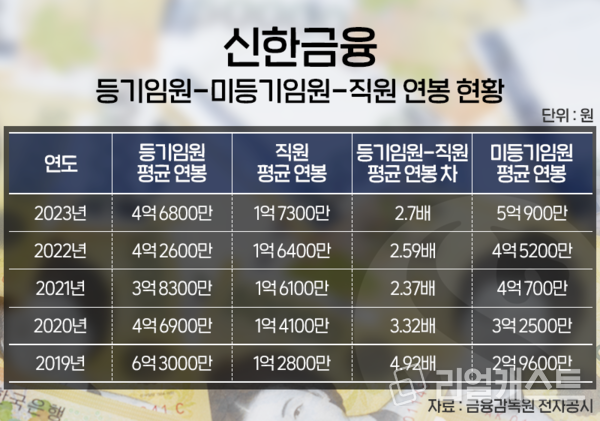 신한금융의 직원 평균 연봉은 1억 7300만 원으로 금융지주 평균 연봉에 비해 살짝 높은 편이며 등기임원과 직원과의 평균 연봉 차이는 2.7배로 4대 금융지주 중 가장 적은 격차로 확인됐습니다. 최근 3년간 등기임원과 직원과 평균 연봉 차이를 2배 대로 유지하며 4대 금융지주 중 가장 균등하게 연봉을 지급하는 것으로 보입니다.