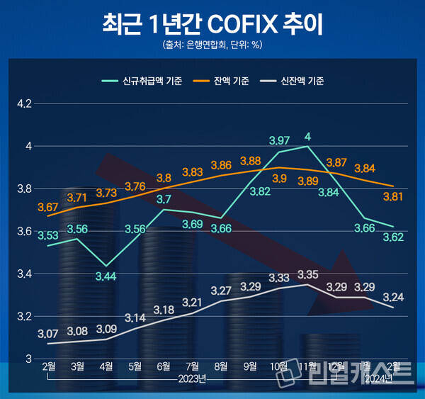 코픽스는 앞서 지난해 9월부터 11월까지 3개월 연속 오르다 지난해 12월 하락전환한 이후 세달 연속 낮아지고 있습니다. 잔액 기준 코픽스 역시 3.84%에서 3.81%로 0.03%p 하락했으며 신 잔액기준 코픽스도 3.24%로 전달 대비 0.05%p 하락한 것으로 조사됐습니다.