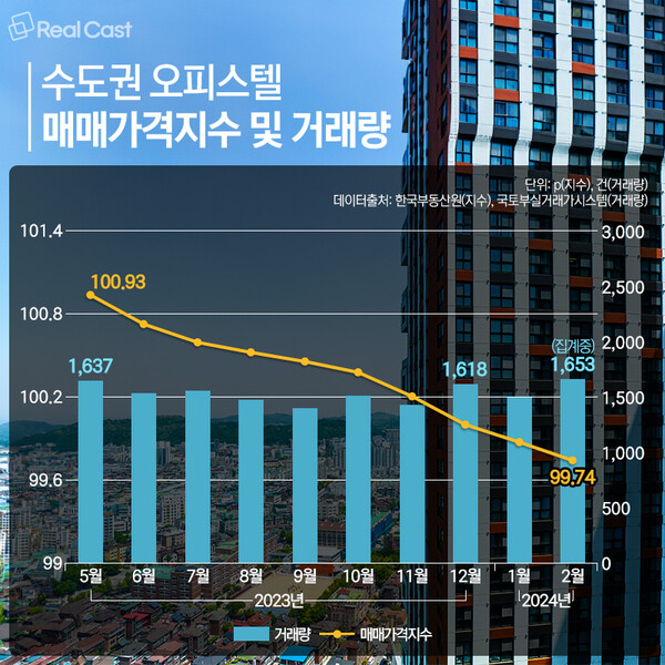 오피스텔 시세는 분명한 하락세를 보입니다. 한국부동산원 자료에 따르면 수도권 오피스텔 매매가격지수는 올해 2월 99.74p를 기록해 전월 대비 0.13% 하락한 것으로 나타났습니다. 2022년 8월 103.55p를 기록하며 하락 전환한 이래 19개월 연속 하락입니다.