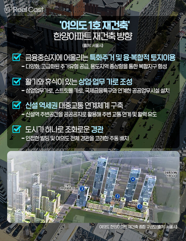 1975년 준공된 영등포구 여의도동 한양아파트는 기존 588가구를 허물고 최고 56층, 5개동, 아파트 956가구와 오피스텔 210실 규모의 국제금융 중심지 기능 지원 단지를 조성하는 재건축사업입니다.
