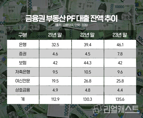 금융당국(금융위원회·금융감독원)이 발표한 ‘23년 말 기준 금융권 부동산PF 대출 현황’에 따르면 부동산PF 대출 잔액이 135조 6000억 원으로 나타났습니다. 이는 1년 전에 비해 5조 3000억 원 증가한 수치입니다.