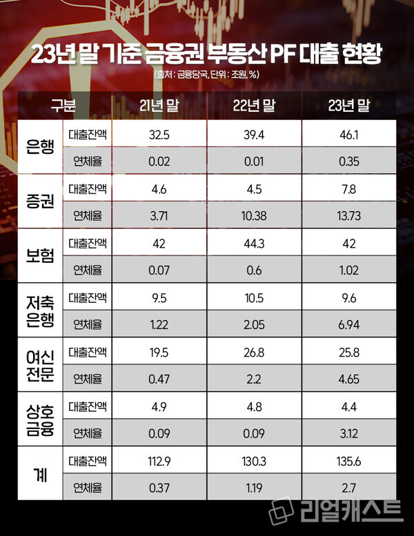 실제로 부동산 PF 연체율은 23년말 기준 2.7%로 나타났습니다. 이는 22년말(1.19%)와 비교하면 2배 이상 높아진 수준으로 전 금융권에서 연체율이 상승했습니다. 특히 저축은행과 증권, 상호금융이 크게 늘어난 것으로 확인됐습니다.