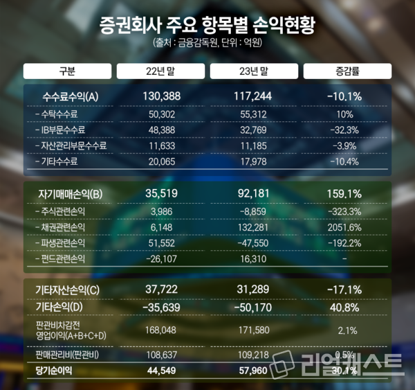 반면 파생관련손익은 크게 감소한 것으로 조사됐습니다. 글로벌 주요 증시 상승에 따른 매도파생결합증권 평가손실 증가 등으로 2022년(5조 1552억 원) 대비 9조 9102억 원이 감소한 -4조 7550억 원으로 조사됐습니다.