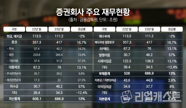증권회사의 지난해 말 기준 부채총액은 601조 6000억 원으로 2022년 말(528조 원) 대비 13.9%(73.6조 원) 증가했습니다. RP매도, 투자자예수금이 늘어난 것이 영향을 미친 것으로 풀이됩니다.