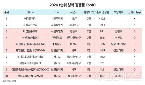 한국부동산원 청약홈 아파트 경쟁률 데이터에 따르면 지난해 전국 아파트 1순위 청약경쟁률 상위 10곳 가운데 7곳이 ‘초품아’ 또는 초등학교를 근거리에 둔 것으로 나타났다.