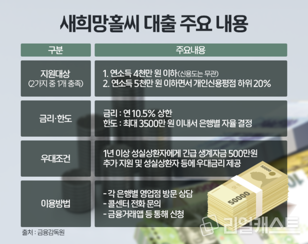 금감원 한 관계자는 "향후에도 새희망홀씨의 서민금융종합플랫폼 연계 등을 통해 서민·취약차주의 접근성을 제고하고 금리부담을 완화하기 위해 지속적으로 노력하겠다"고 밝혔습니다.
