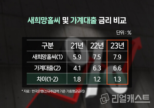 23년 새희망홀씨 평균금리는 7.9%로 22년 대비 0.4%p 올랐지만 가계신용대출(6.6%)과의 차이는 1.3%p로 22년과 유사한 수준을 기록했습니다.