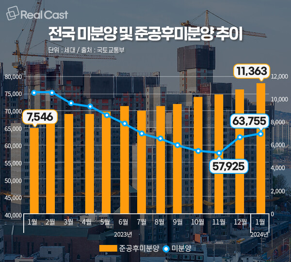 미분양 아파트가 6만 3천 세대를 돌파했습니다. 국토교통부 자료에 따르면 올해 1월 기준 전국 미분양 물량은 6만 3,755세대에 달합니다. 미분양 물량이 6만 3천 세대를 넘은 건 2023년 7월 이후 반년 만입니다.
