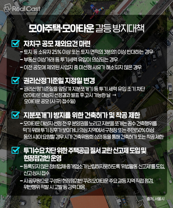 서울시에 따르면 최근 모아주택·모아타운 투기 세력 유입을 차단하고, 사업을 희망하는 지역 주민들을 적극적으로 지원하기 위해 ‘모아주택·모아타운 갈등 방지대책’을 내놨습니다.