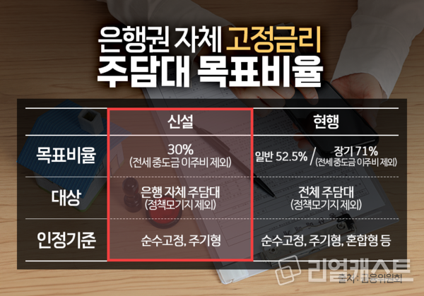 금융감독원(이하 금감원)은 금융권 주택담보대출 구조 개선을 위해 은행 자체 고정금리 주택담보대출 목표비율 30%을 신설하고 분할상환 목표비율을 높이는 新행정지도를 시행합니다. 금감원은 지난 2014년부터 고정금리·비거치식 분할상환 대출 비중을 확대하기 위해 행정지도를 실시하고 있습니다.