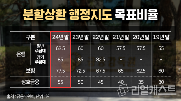 이외에도 전년도 목표달성 현황과 추가 개선여력 등을 고려해 기존 분할상환 목표비율은 소폭 상향했습니다. 은행 일반 주담대 2.5%p, 상호·보험을 5%p 상향 조정하였으며 은행 장기 주담대는 현재 분할상환 비중이 82.8%에 달하는 만큼 목표비율을 현행과 같이 유지하기로 했습니다.