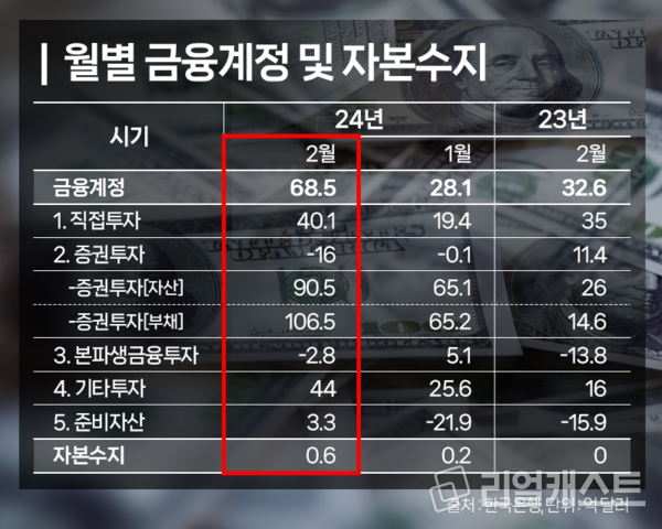 자본 유출입을 보여주는 금융계정은 68억 5000만 달러 순자산 증가한 것으로 조사됐습니다. 세부적으로 보면 직접투자는 내국인 해외투자의 경우 2차전지 업종을 중심으로 33억 달러 증가한 것으로 나타났으며 외국인의 국내투자는 7억 1000만 달러 감소한 것으로 확인됐습니다.