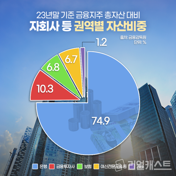 금융지주회사 총자산 대비 자회사 등 권역별 자산 비중은 은행이 계속해서 가장 높은 것으로 확인됐습니다. 자산 비중이 지난해 말에 비해 0.1% 감소한 74.9%로 나타났지만 대다수를 차지하고 있으며 이어 금융투자사(10.3%), 보험(6.8%), 여신전문금융 등(6.7%) 순으로 확인됐습니다.
