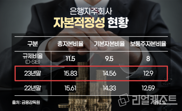 23년 말 기준 은행지주의 총자본, 기본자본, 보통주 자본비율은 각각 15.83%, 14.56%, 12.9%으로 전년 말 대비 전체적으로 소폭 상승했습니다. 특히 은행지주 8개사 모두 규제비율(총자본비율 11.5%, 기본자본비율 9.5%, 보통주자본비율 8%)을 상회하며 자본 안정성을 유지하고 있습니다.