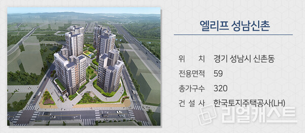 한국토지주택공사(LH)는 경기 성남시 신촌동 성남신촌지구에 짓는 공공분양 아파트인 ‘엘리프 성남신촌’을 분양합니다. 올해 첫 신생아특별공급 적용 대상 공공분양 물량입니다. 서울 강남 세곡동과 인접한 준강남 생활권으로 세곡천, 세곡해오름 근린공원 등도 가깝습니다.