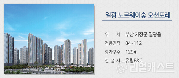부산 기장군 일광읍에서는 유림E&C가 ‘일광 노르웨이숲 오션포레’를 분양합니다. 동해선 일광역 역세권 단지로 추후 부산도시철도 4호선이 연결되면 더블 역세권이 됩니다. 인근에 일광해수욕장이 있어 오션뷰가 가능하고, 조경에는 삼성물산 조경팀이 참여했습니다. 대형 키즈카페, 게스트하우스, 사우나 등 커뮤니티 시설도 다양합니다.