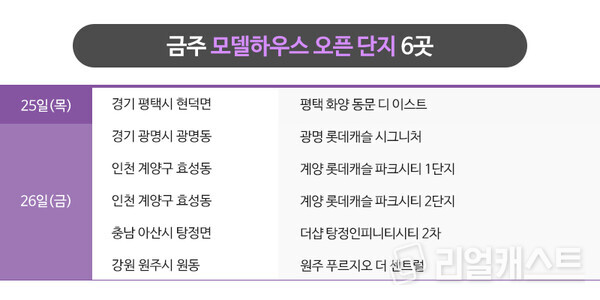금주에는 총 6곳의 모델하우스 오픈 예정입니다. 각각 경기 2곳(평택, 광명), 인천 계양, 충남 아산, 강원 원주에 위치합니다.