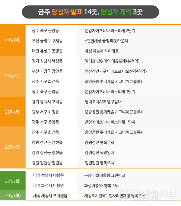 금주 분양시장은 전주의 절반 수준까지 물량이 줄었습니다. 다만, 경기 성남, 인천 중구 등 수도권에 분양가 상한제 단지들이 분포하고 있어 수요자들의 부담을 다소 덜어줄 것으로 기대되고 있습니다.
