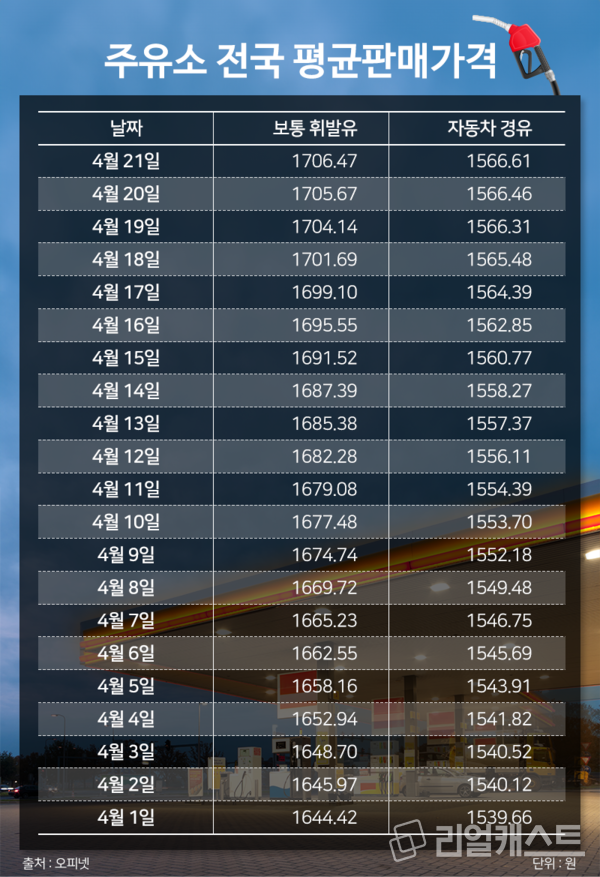 한국석유공사가 운영하는 오피넷에 따르면 21일 기준 휘발유값은 1L당 주유소 전국 평균 판매가격이 1706.47원을 기록했습니다. 지난 18일 5개월 만에 1700원을 돌파한데 이어 계속 오르고 있는 상황입니다. 경유값 역시 주유소 전국 평균 판매가격이 1L당 1566.61원으로 올해 최고치를 경신했습니다.