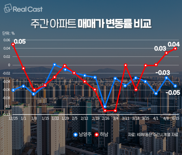 반면 3월 첫째 주 -0.11%를 기록하며 2주 연속 하락폭이 컸던 하남시는 4월 둘째 주 0.03%로 지난해 12월 마지막 주 0.05%를 기록한 이래 14주만에 반짝 상승했습니다. 이후 셋째 주에도 0.04%로 상승세를 이어갔습니다.