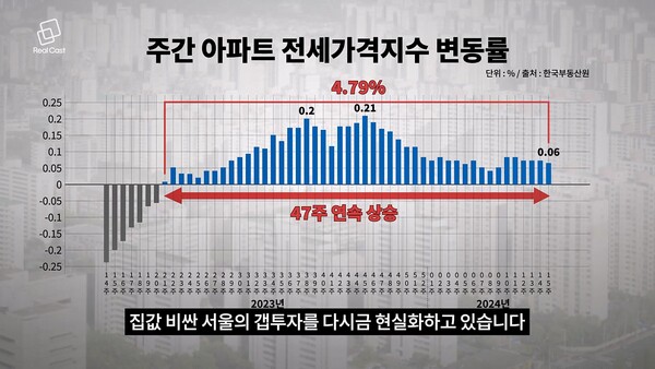 전세가격도 계속 오르고 있죠. 한국부동산원 전세가격지수는 지난해 5월 셋째 주에 시작한 상승이 올해 4월 둘째 주까지도 멈추지 않고 있습니다. 47주 연속입니다. 이 사이 상승분은 4.79%에 달합니다. 가파른 전세가격 상승이 집값 비싼 서울의 갭투자를 다시금 현실화하고 있습니다.